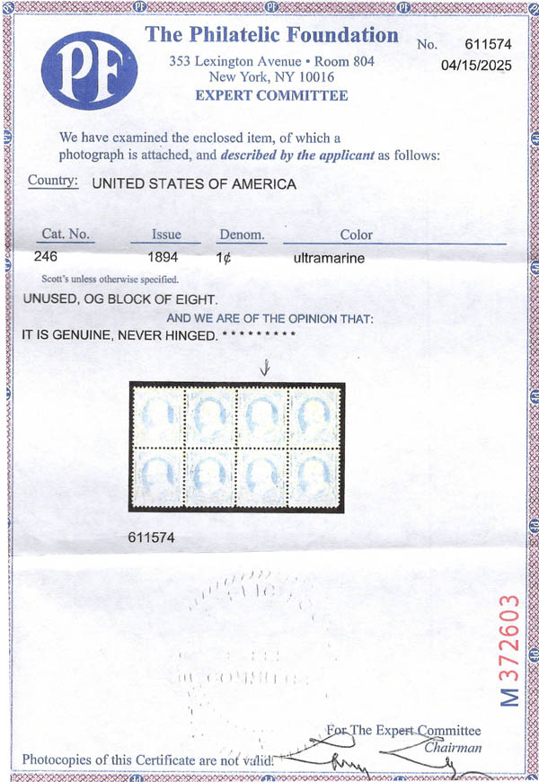 1894, 1¢ Franklin, ultramarine, unwatermarked (Scott 246), très beau ou miuex. Scott $90.