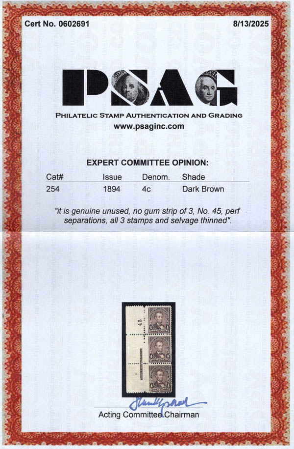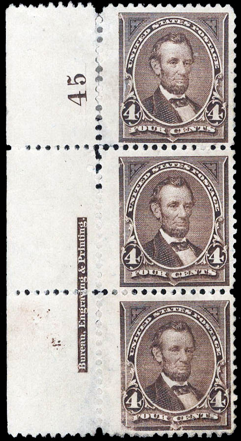 1894, 4¢ Lincoln, dark brown, unwatermarked (Scott 254), sinon beau à très beau. Scott $800 for o.g.