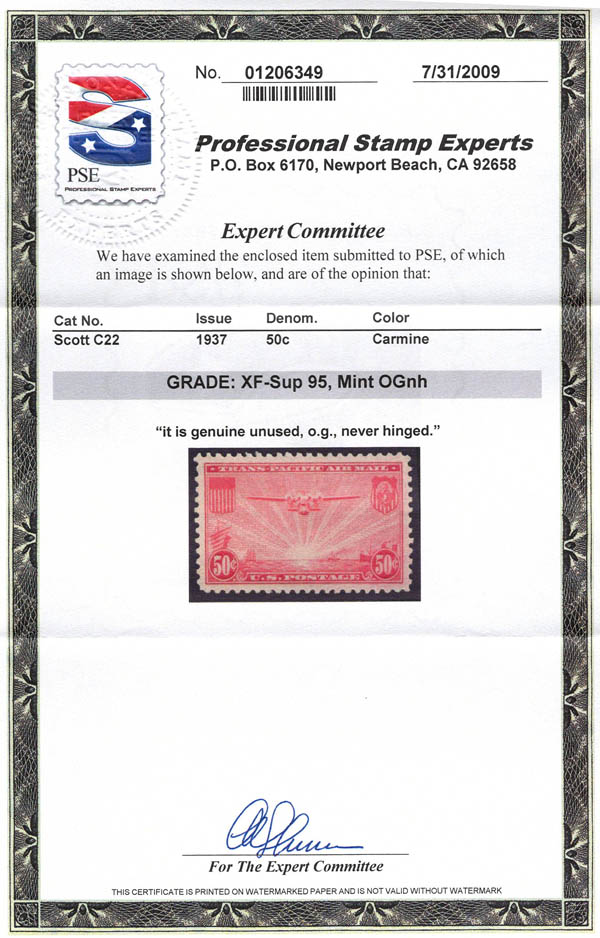 Airmail, 1937, 50¢ China Clipper (Scott C22), superbe. SMQ $75.