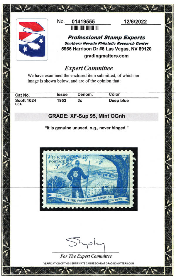 1953, 3¢ Future Farmers (Scott 1024), superbe. SMQ $40.