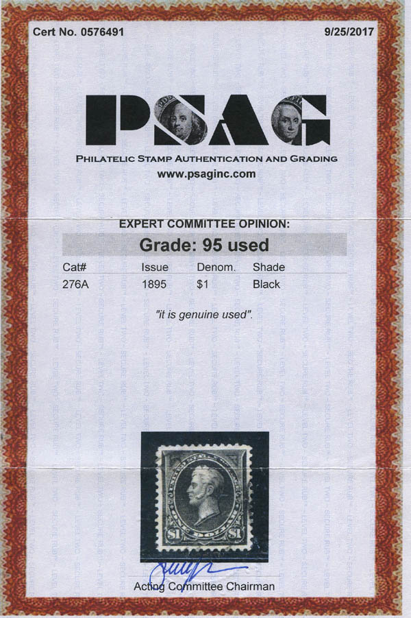 1895, $1 Perry, black, type II, D.L. watermark (Scott 276A), XF-SUP 95, very scarce this nice. Scott $200. SMQ $1,400. Scott Stamp Values $1,250.