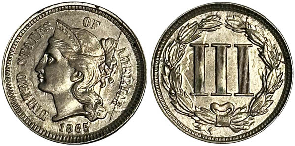 1865 Nickel Three Cents. Presque fleur de coin +.
