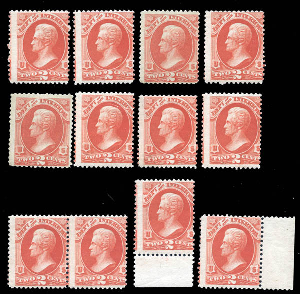 Interior Dept., 1873, 2¢ vermilion (Scott O16), wholesale group of 11, en général beau. Scott $1,670.