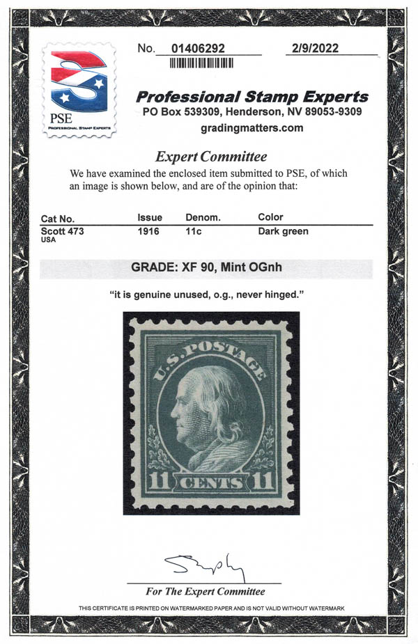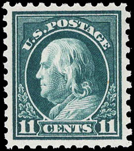 1916, 11¢ Franklin, dark green, unwatermarked, perf. 10 (Scott 473), XF 90. Scott $110. SMQ $225.