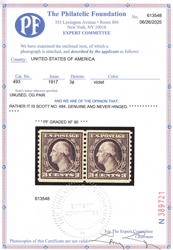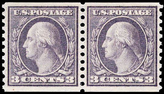 1918, 3¢ Washington, violet, type II, unwatermarked, rotary press coil, perf. 10 vertically (Scott 494), XF 90. Scott $50. SMQ $110.