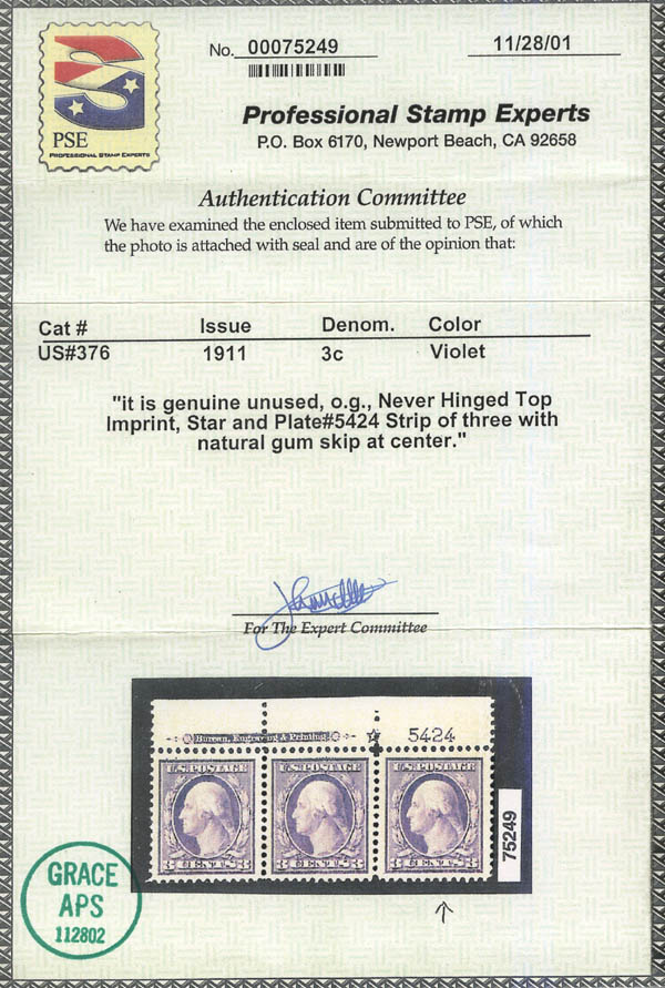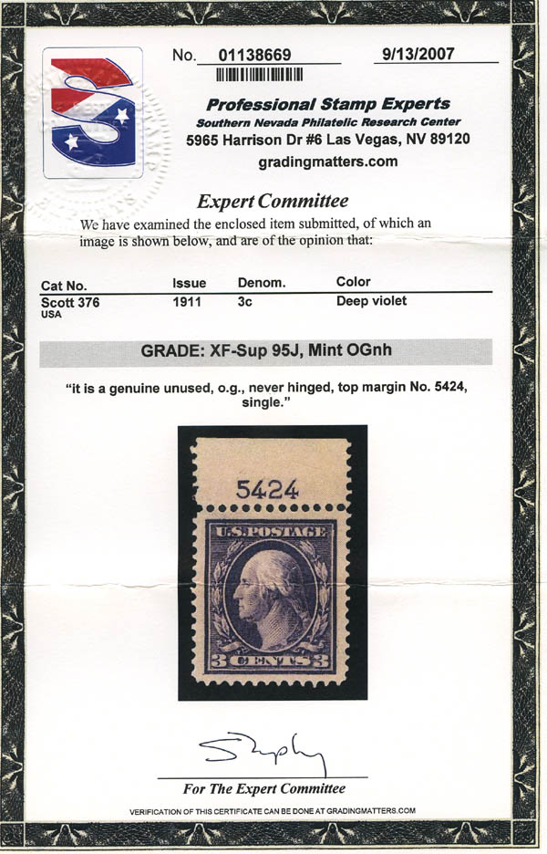 1911, 3¢ Washington, type I, deep violet, S.L. watermark (Scott 376), XF-SUP 95 J. Scott $40. SMQ $550.