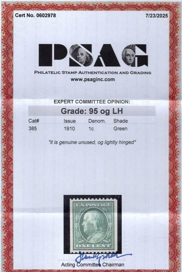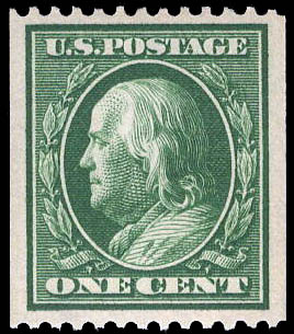 1910, 1¢ Franklin, green, S.L. watermark, vertical coil, perf. 12 horizontally (Scott 385), XF-SUP 95. Scott $50. SMQ $135. Scott Stamp Values $105.