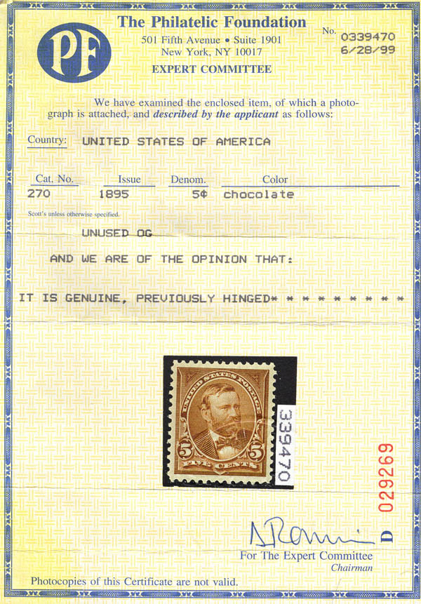 1895, 5¢ Grant, chocolate, D.L. watermark (Scott 270), superbe. Scott $35.