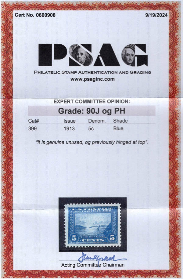 1913, 5¢ Panama-Pacific, perf. 12 (Scott 399), XF 90 J. Scott $70. SMQ $155.