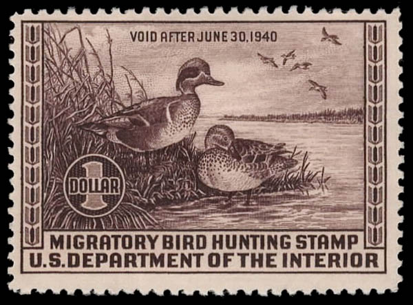 Hunting Permit, 1939, $1 Green-Winged Teals (Scott RW6), presque très beau. Scott $115.