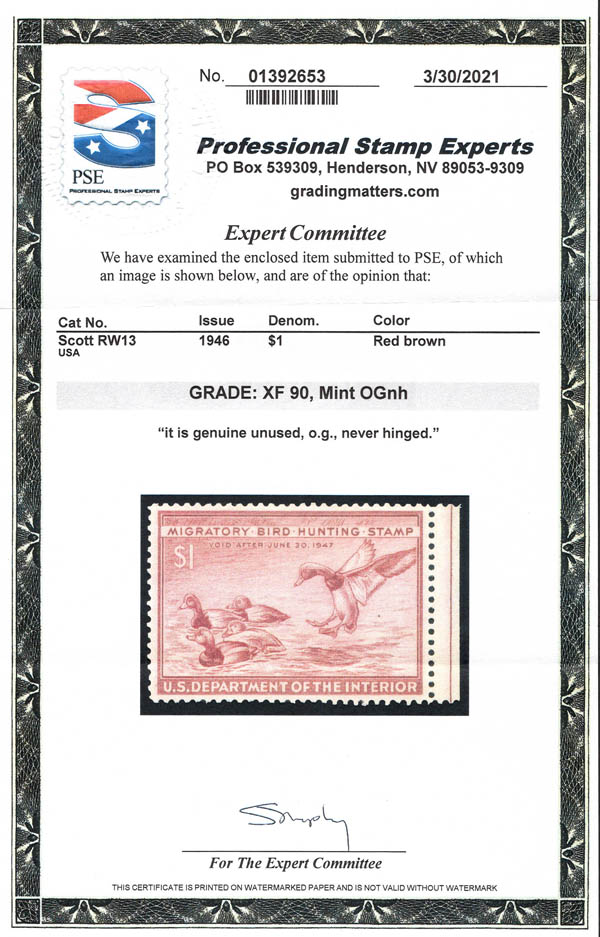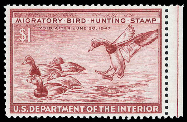 Hunting Permit, 1946, $1 Redhead Ducks (Scott RW13), superbe. SMQ $110.