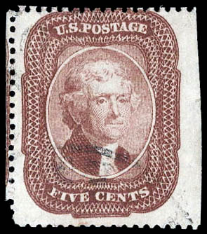 1857, 5¢ Jefferson, red brown, type I (Scott 28), beau ou presque beau. Scott $1,100.