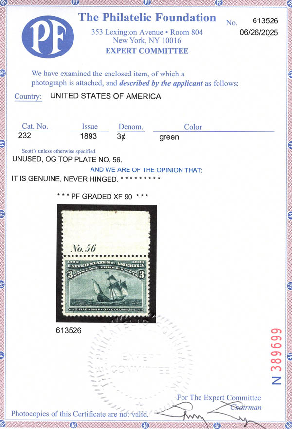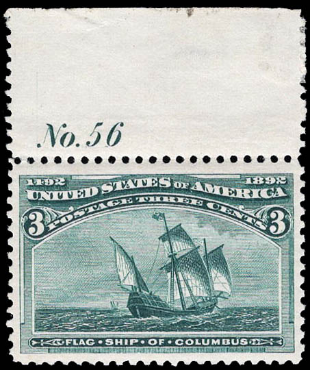 1893, 3¢ Columbian (Scott 232), XF 90. Scott $98. SMQ $185.