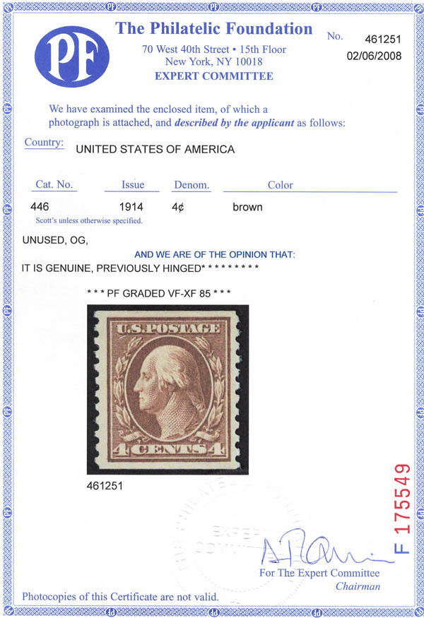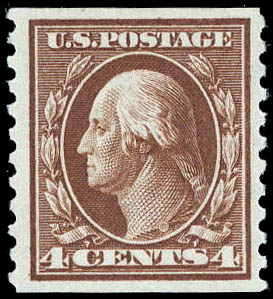 1914, 4¢ Washington, brown, S.L. watermark, flat plate coil, perf. 10 vertically (Scott 446), VF-XF 85. Scott $130. SMQ $160. Scott Stamp Values $160.