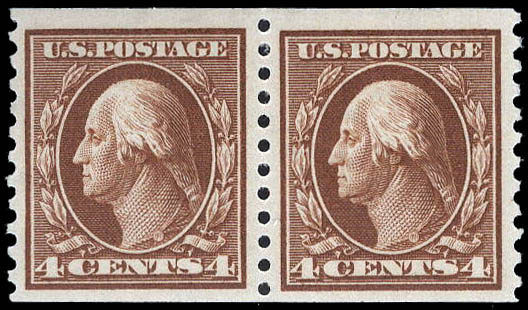 1914, 4¢ Washington, brown, S.L. watermark, flat plate coil, perf. 10 vertically (Scott 446), VF-XF 85. Scott $300. SMQ $350. Scott Stamp Values $350.