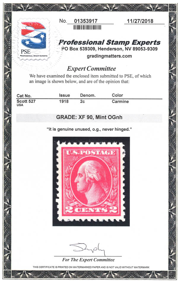 1918, 2¢ Washington, type V, carmine, offset printing (Scott 527), XF 90. Scott $40. SMQ $115.
