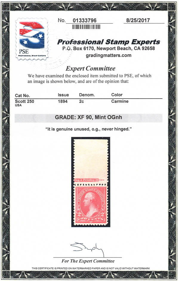 1894, 2¢ Washington, type I, carmine, unwatermarked (Scott 250), XF 90. Scott $100. SMQ $365.