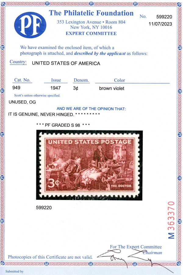 1947, 3¢ Doctors (Scott 949), superbe. SMQ $90.