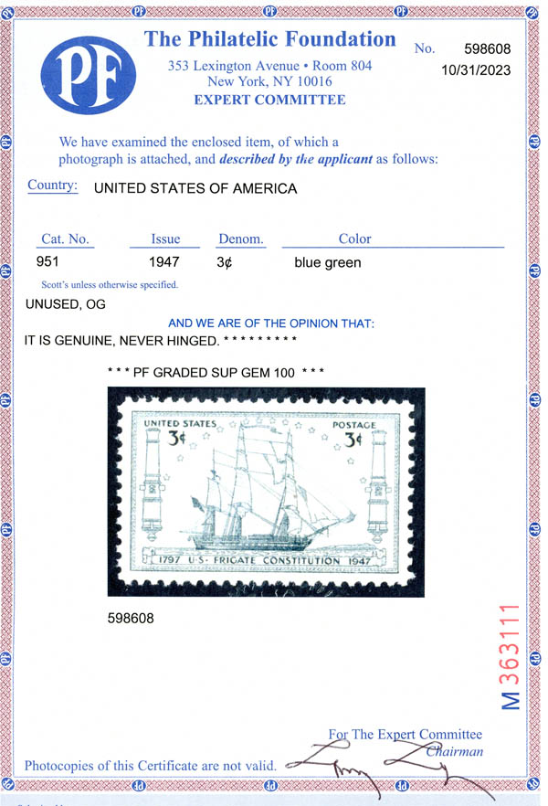 1947, 3¢ U.S. Frigate Constitution (Scott 951), superbe. SMQ $210.