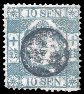 Japan, 1872, Cherry Blossom, 10s blue green, Matsuda printing, native wove paper (J.S.C.A. 12a), beau. J.S.C.A. 34,000 yen ($310). Scott 15; $150.