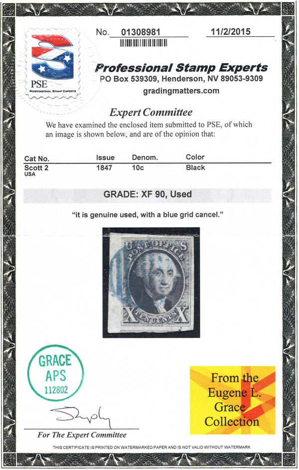 Lot 1 o 1847, 10¢ Washington, black (Scott 2), ample to massive margins even showing part of the adjacent stamp at bottom, blue grid cancel, Extremely Fine, with 2015 P.S.E. certificate graded XF 90. Scott $900. SMQ $1,300. Estimate $800 - 1,200. |