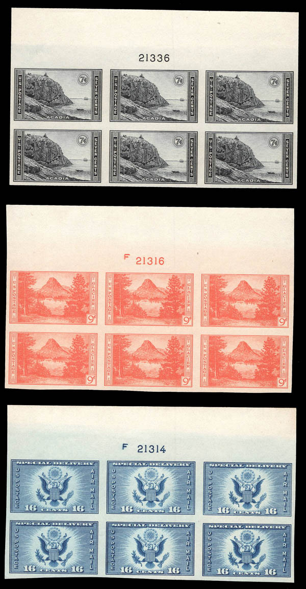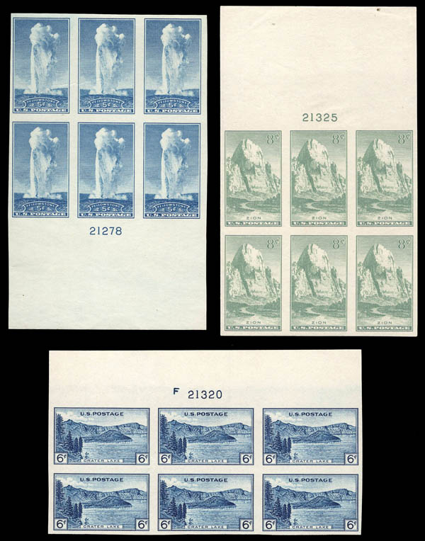 1934-35, a group of Farley imperf plate blocks (Scott 754-764, 771), without gum as issued; 2¢ Parks with a light wrinkle, otherwise Very Fine. Scott $335.