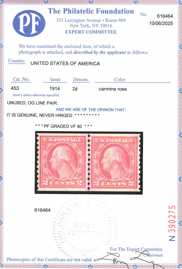 Lot 190![]() ![]() 1914, 2¢ Washington, type I, carmine rose, S.L. watermark, rotary press coil, perf. 10 vertically (Scott 453), line pair, beautifully well centered, o.g., never hinged, Very Fine, with 2025 P.F. certificate graded VF 80. Scott $1,600. Estimate $1,000 - 1,500. |
