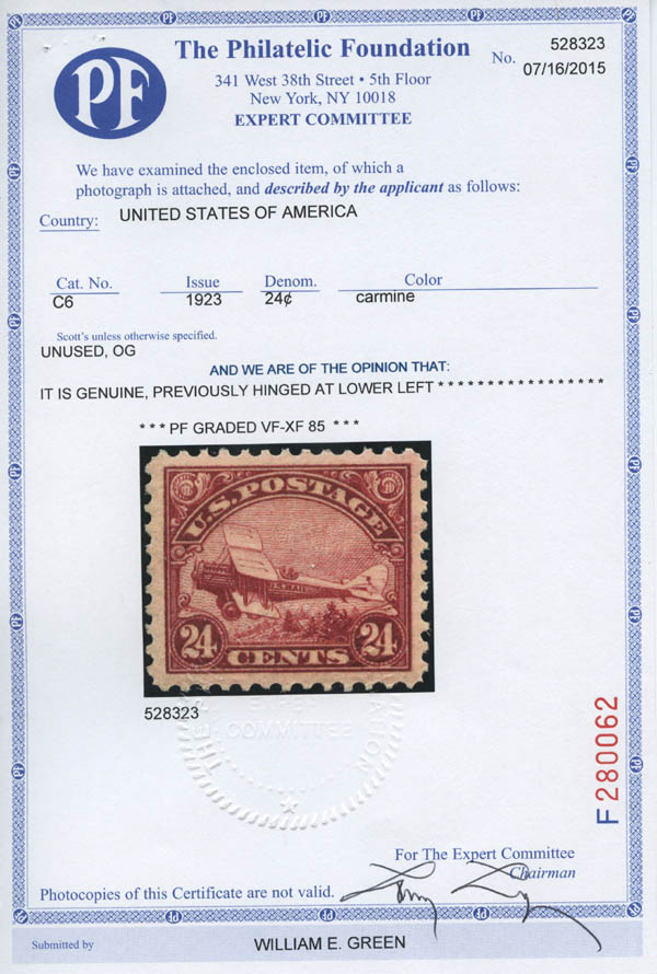 Lot 345![]() Airmail, 1923, 24¢ Biplane (Scott C6), wonderfully well centered, o.g., barest trace of hinge, Very Fine to Extremely Fine, with 2015 P.F. certificate graded VF-XF 85, plus an ungraded 2000 P.F. certificate for the block from which it came. Scott $65. SMQ $175. Estimate $100 - 150. |