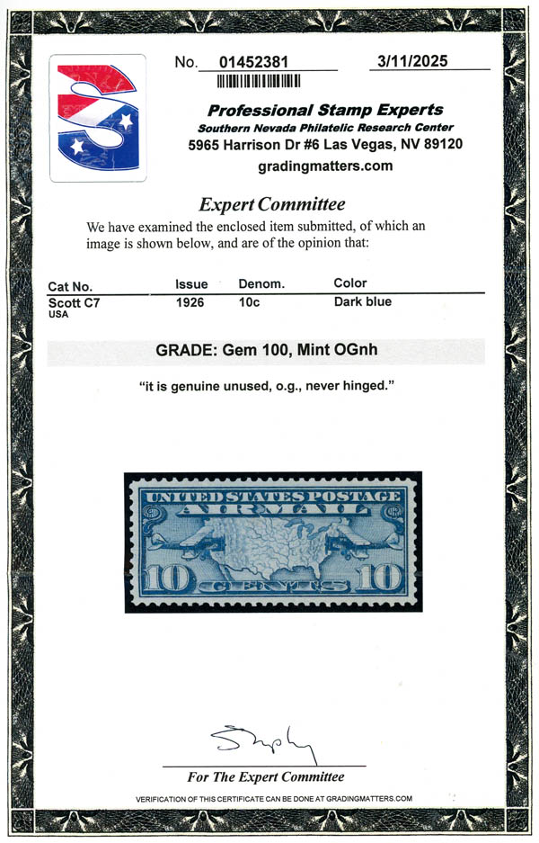 Lot 450![]() ![]() Airmail, 1926, 10¢ Map & Planes (Scott C7), impeccably centered, with fresh color - simply a perfect gem! o.g., never hinged, Superb, with 2025 P.S.E. certificate graded GEM 100, only 5 with this lofty grade in the P.S.E. Population Report, and only 2 higher. SMQ $1,500. Estimate $1,000 - 1,500. |