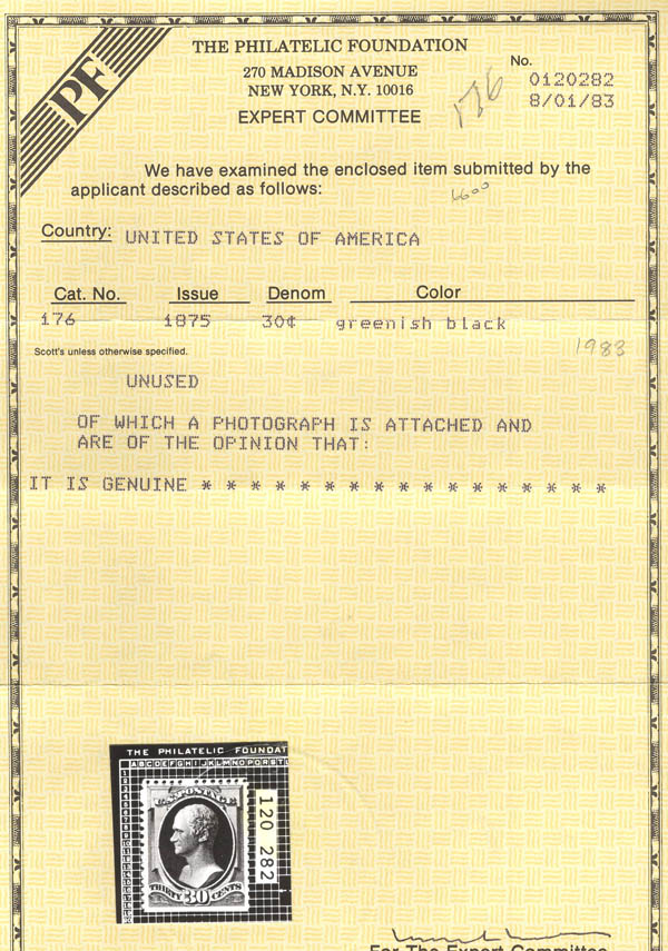 Lot 483 ( )1875, 30¢ Hamilton, greenish black, C.B.N.C. "Hard Paper" Special Printing (Scott 176), magnificent centering and perfs that are remarkably choice for this issue, without gum as issued, Very Fine or better, with 1983 P.F. certificate. Scott $12,000. Estimate $7,500 - 10,000 The Scott catalog notes "although perforated, these stamps were usually cut apart with scissors. As a result, the perforations are often much mutilated and the design is frequently damaged." The example here is a true gem, a rare issue and in extremely rare quality. Only 179 were sold of both the hard paper and soft paper special printings of the 30¢, and the Siegel census indicates only 52 of the hard paper 30¢ are available to collectors. |