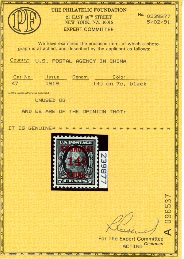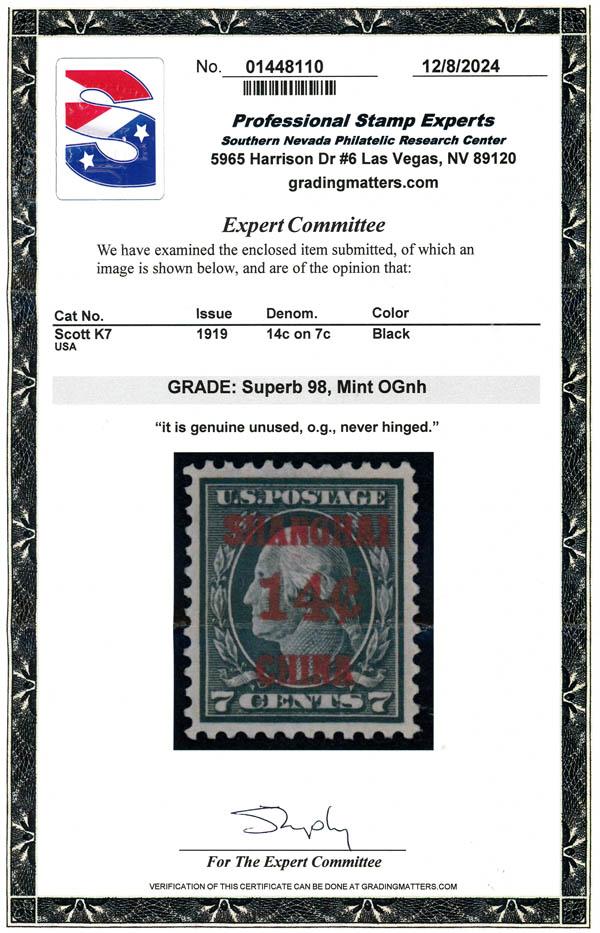 Lot 488![]() ![]() Offices in China, 1919, 14¢ on 7¢ black (Scott K7), a stunning world-class gem, perfectly centered and worthy of the finest collection, o.g., never hinged, Superb, with 1991 P.F. and 2024 P.S.E. certificates, the latter graded SUP 98, this is the highest grade listed in P.S.E.'s Population Report, with only 2 others known at this lofty grade. Scott $215. SMQ $4,250. Estimate $3,000 - 4,000. |