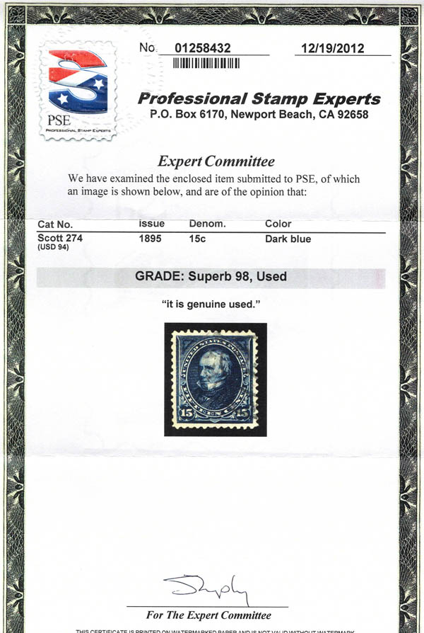 Lot 52 o 1895, 15¢ Clay, dark blue, D.L. watermark (Scott 274), impeccable centering, with deep rich color and sharp details, and a light almost face free cancel, Superb, with 2012 P.S.E. certificate graded SUP 98. Scott $18. SMQ $1,400. Estimate $1,000 - 1,500. |