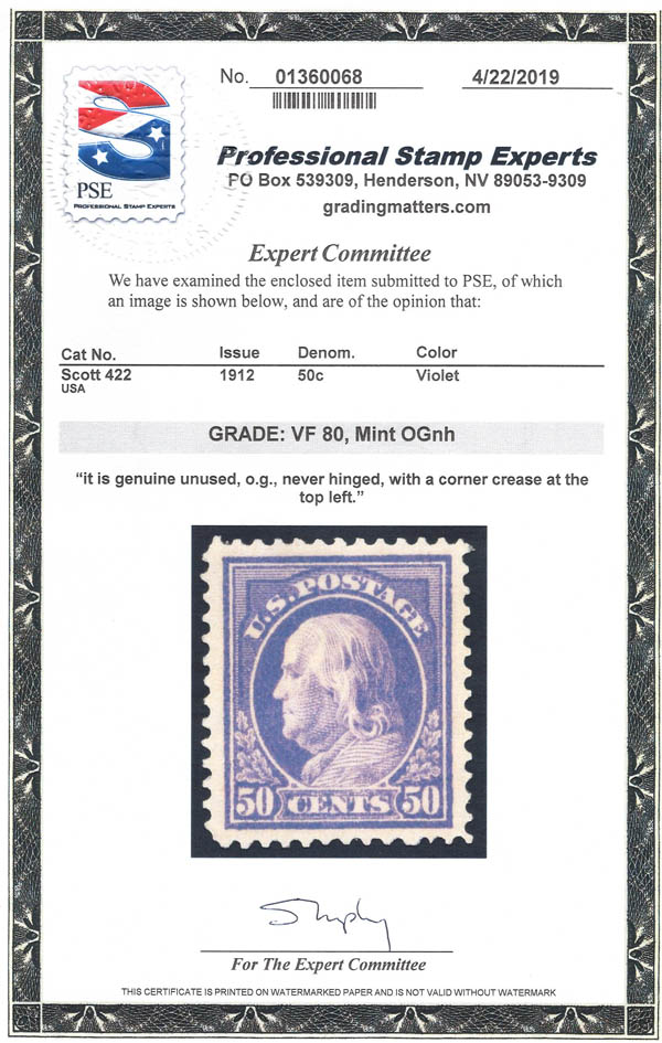 Lot 53![]() ![]() 1912, 50¢ Franklin, violet, D.L. watermark, perf. 12 (Scott 422), outstandingly well centered, o.g., never hinged, Extremely Fine, with 2019 P.S.E. certificate graded XF 90. Scott $500. SMQ $1,150. Estimate $750 - 1,000. |