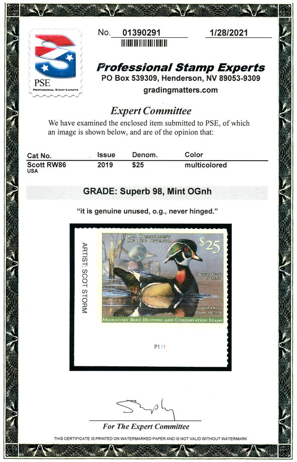 Lot 598![]() ![]() Federal Duck Stamps, 2017, 2019 and 2020, $25 denominations, 3 different (Scott RW84, RW86, RW87), o.g., never hinged, Superb, each with 2019-2021 P.S.E. certificate graded SUP 98 (RW87) or Gem 100 (others). SMQ $505. Estimate $250 - 350. |