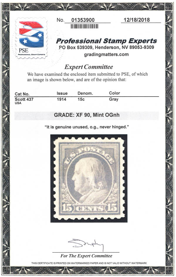 1914, 15¢ Franklin, gray, S.L. watermark, perf. 10 (Scott 437), outstandingly well centered, o.g., never hinged, Extremely Fine, with 2018 P.S.E. certificate graded XF 90. Scott $275. SMQ $575.