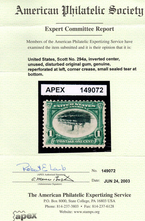 Lot 647![]() 1901, 1¢ Pan-American, center inverted (Scott 294a), disturbed o.g.; small faults (reperfed at left, a corner crease, and a small sealed tear at bottom), Fine appearance, with 2003 A.P.S. certificate, a very collectable example of this rare and popular invert. Scott $11,500. Estimate $2,500 - 3,500. |