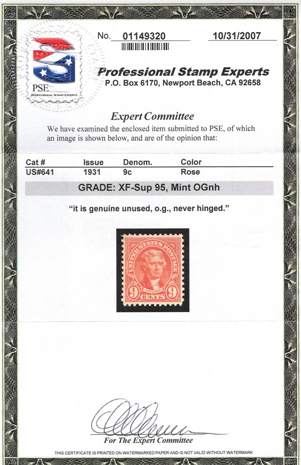 1931, 9¢ Jefferson, rotary press printing (Scott 641), o.g., never hinged, Extremely Fine to Superb, with 2007 P.S.E. certificate graded XF-SUP 95. SMQ $170.