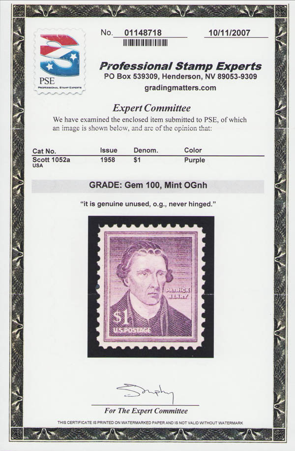 Lot 984![]() ![]() 1958, Liberty Issue, $1 Patrick Henry, dry printing (Scott 1052a), o.g., never hinged, Superb, with 2007 P.S.E. certificate graded GEM 100, seriously undervalued by P.S.E., as only 5 are known with this top grade, and none higher. SMQ $300. Estimate $350 - 500. |