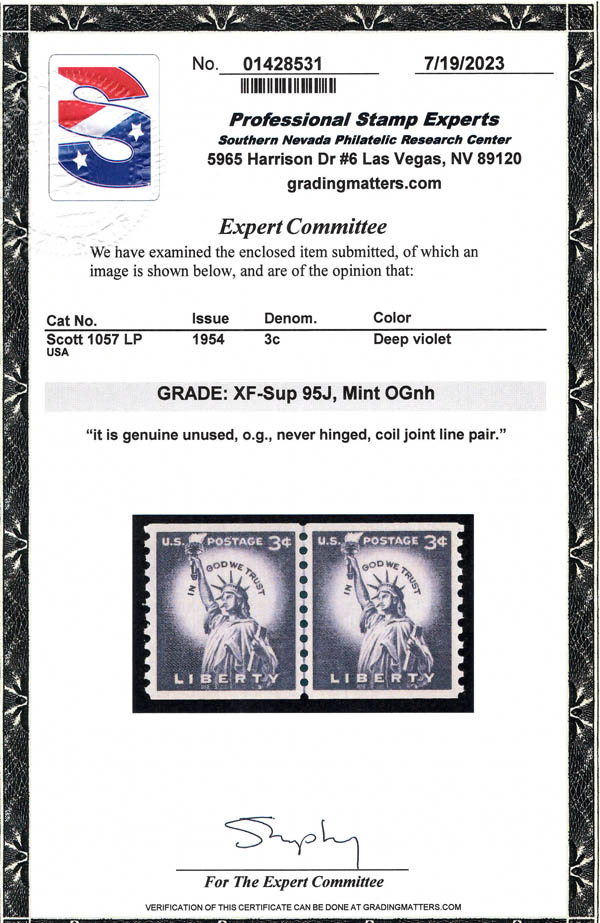Lot 987![]() ![]() 1954, Liberty Issue, 3¢ Statue of Liberty, horizontal coil, large perf. holes, wet printing (Scott 1057), line pair, o.g., never hinged, Extremely Fine to Superb, with 2023 P.S.E. certificate graded XF-SUP 95J. SMQ $110 for 95. Estimate $80 - 120. |